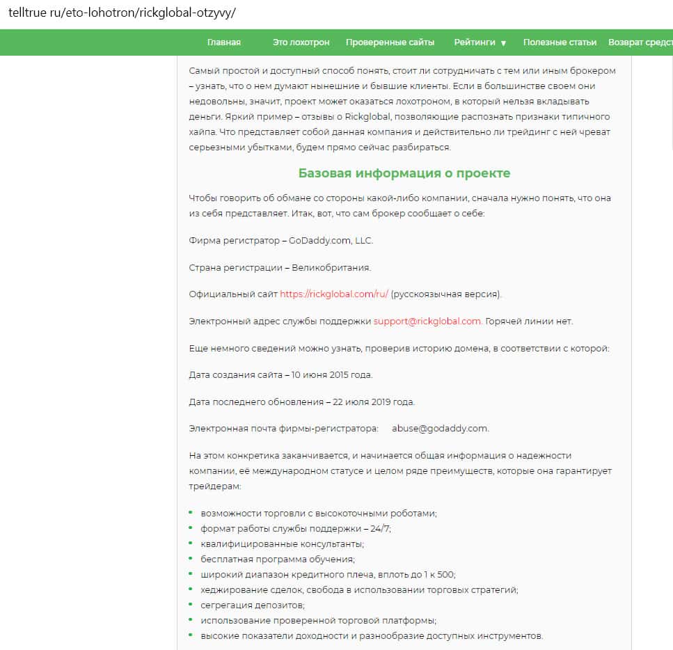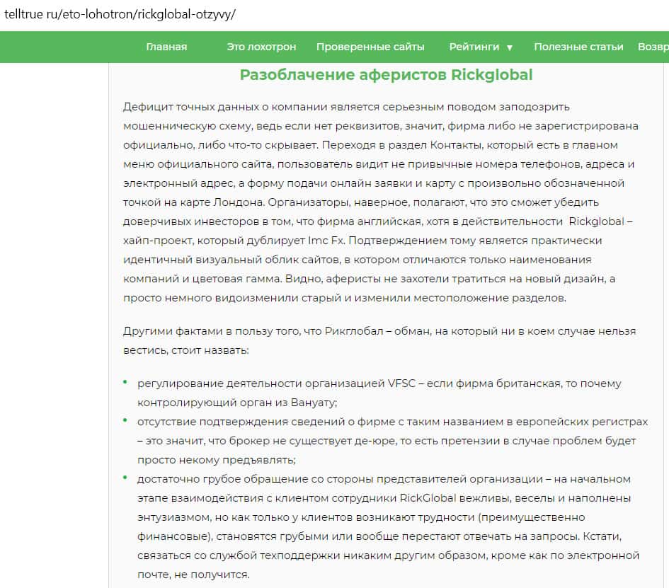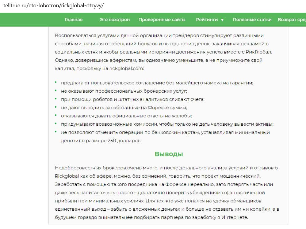 - Что говорит о проекте Рик Глобал сайт telltrue ru, занимающийся проверкой брокерских компаний?