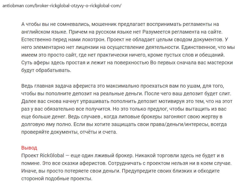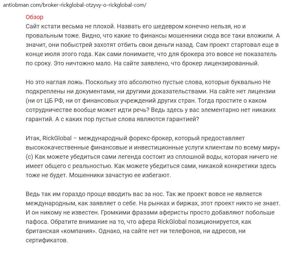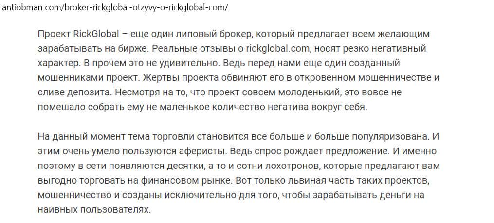 - Статья на сайте antiobman com: несмотря на молодость проекта RickGlobal, он сумел собрать вокруг себя большое количество негатива