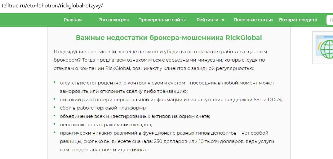 Какие важные недостатки имеет дилинговая компания Рик Глобал, по мнению сайта telltrue ru?