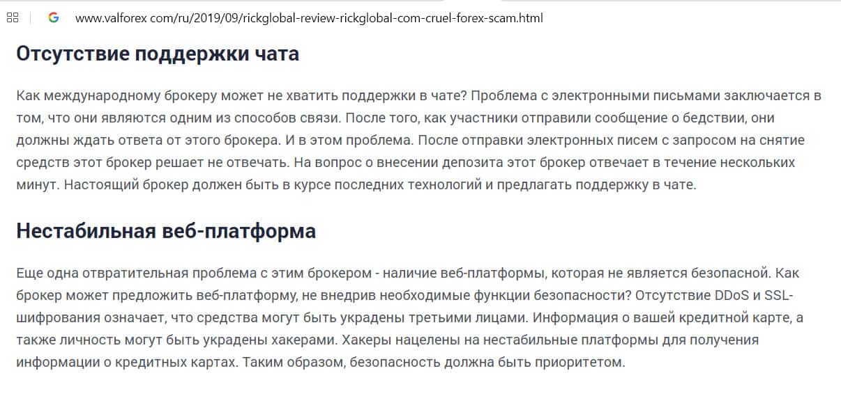 - Сайт valforex com считает, что платформа Рик Глобал имеет проблемы со связью и безопасностью