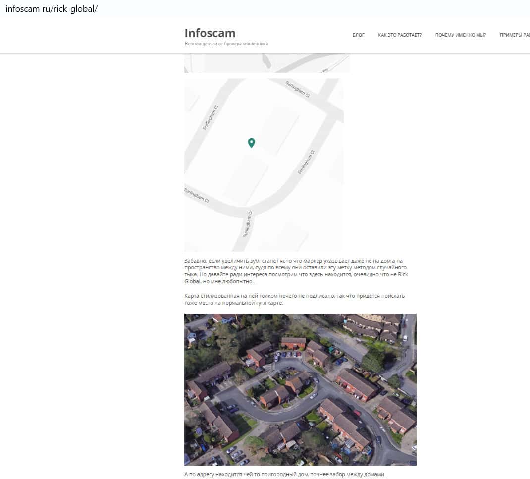 Автор материала о мошенниках из Рик Гобал на сайте Инфоскам, как и многие другие, заинтересовался, где же на самом деле находятся жулики. Он увеличил геометку на гугл карте и нашел приблизительное местонахождение этой конторы. Получается, что международный брокер со штаб-квартирой в Лондоне располагается у забора между двумя частными домами в пригороде. Вранье о местоположении налицо!