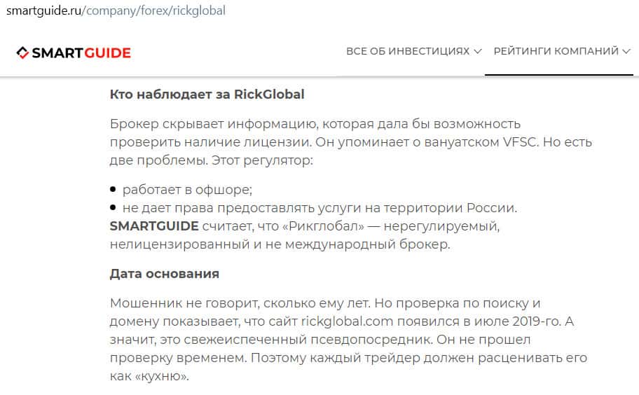 Сайт smartguide ru назвал компанию Рик Глобал низкопробным аферистом, выдающим себя за лицензированного брокера