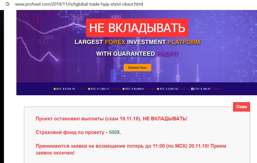 Предупреждение от сайта profvest com о том, что площадка Рик Глобал является скамом, не выплачивающим деньги кдиентам