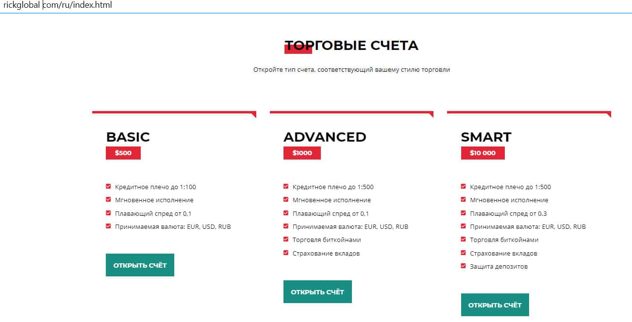 Любой человек, который внимательно посмотрит на предлагаемые системой Рик Глобал учетные записи, сразу поймет, что они созданы для обдуривания клиентов. Организаторы площадки используют три вида аккаунтов, чтобы создать видимость разнообразия, но на деле они почти ничем не отличаются друг от друга. Подозрение вызывают и минимальные суммы взносов - намного большие, чем у других брокеров.