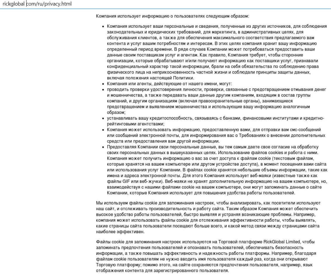 Организаторы псевдобиржи Рик Глобал потрудились и нацарапали свою политику конфиденциальности. Ничего особо интересного, кроме того, что компания имеет право влезать на ваш компьютер во время посещения вами их сайта, считывать информацию о вас и затем использовать ее в своих целях. Что еще можно ожидать от этих мошенников!?