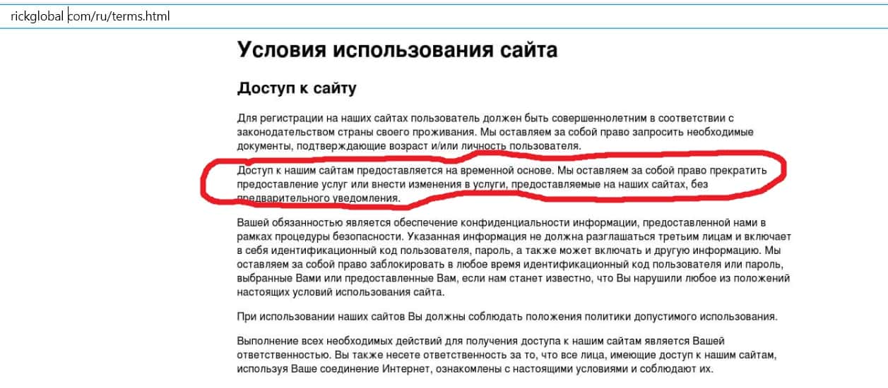 Условия пользования сайтом Рик Глобал настолько дикие, что диву даешься, как организаторы смогли придумать такое. Они пишут прямым текстом, что оставляют за собой право в любой момент прекратить предоставление услуг, не уведомляя об этом пользователей. Этот пункт забирает у клиентов биржи все права самым наглым образом.