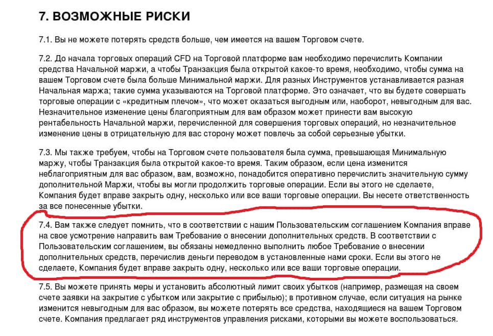Начав врать, мошенники из Рик Глобал уже не останавливаются. В разделе о раскрытии рисков говорится, что клиент не может потерять сумму, большую, чем лежит на его депозите. Это наглая ложь, так как в пункте 7.4. указано, что сотрудники компании в любой момент вправе потребовать от клиента внесения дополнительных средств на его счет.