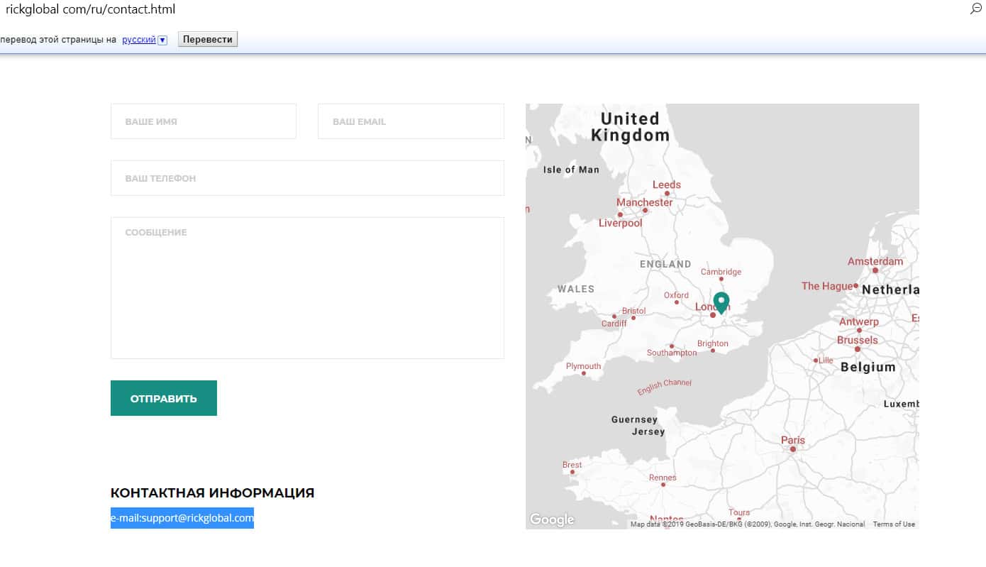 Что можно увидеть, перейдя в раздел сайта rickglobal com Контакты? Часть карты с геометкой в районе Лондона, форму для заполнения обратной связи и адрес электронной почты e-mail:[email protected]. Это все, ни телефонов, ни адресов офиса, ничего больше. Как известно, на письма своих клиентов жулики предпочитают не отвечать.