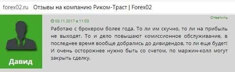 В очередной раз о ненадлежащем уровне сервиса говорит нам Давид, который является сотрудников Риком-Траст уже более года. Жулики повышают комиссию за использование их сервиса, и даже берут процент с дивидендов, однако должного выхлопа клиент за всё это не получает. Стоит ли говорить, что это ну никак не соответствует статусу чуть ли Господа Всемогущего среди всех инвестиционных компаний. Обычная конторка, набивающая себе цену дешевой рекламой и не готовая давать клиентам ту степень обслуживания, о которой заявляет.