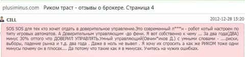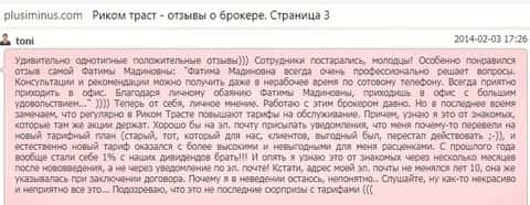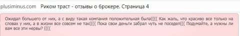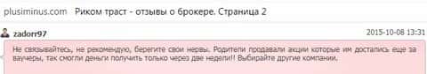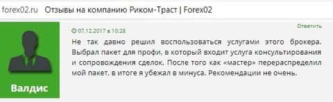 И это не был не единственный сайт с настоящими мнениями о шарашкиной конторе Риком Траст. Еще больше отзывов об этих аферистах мы смогли найти на веб-портале плюсиминус ком. На ней собраны как позитивные так и негативные, но, по обычаю, негативные выглядят более живо и не вылизано, что не удивительно после того, что мы увидели на свободном ресурс форекс02 ру.