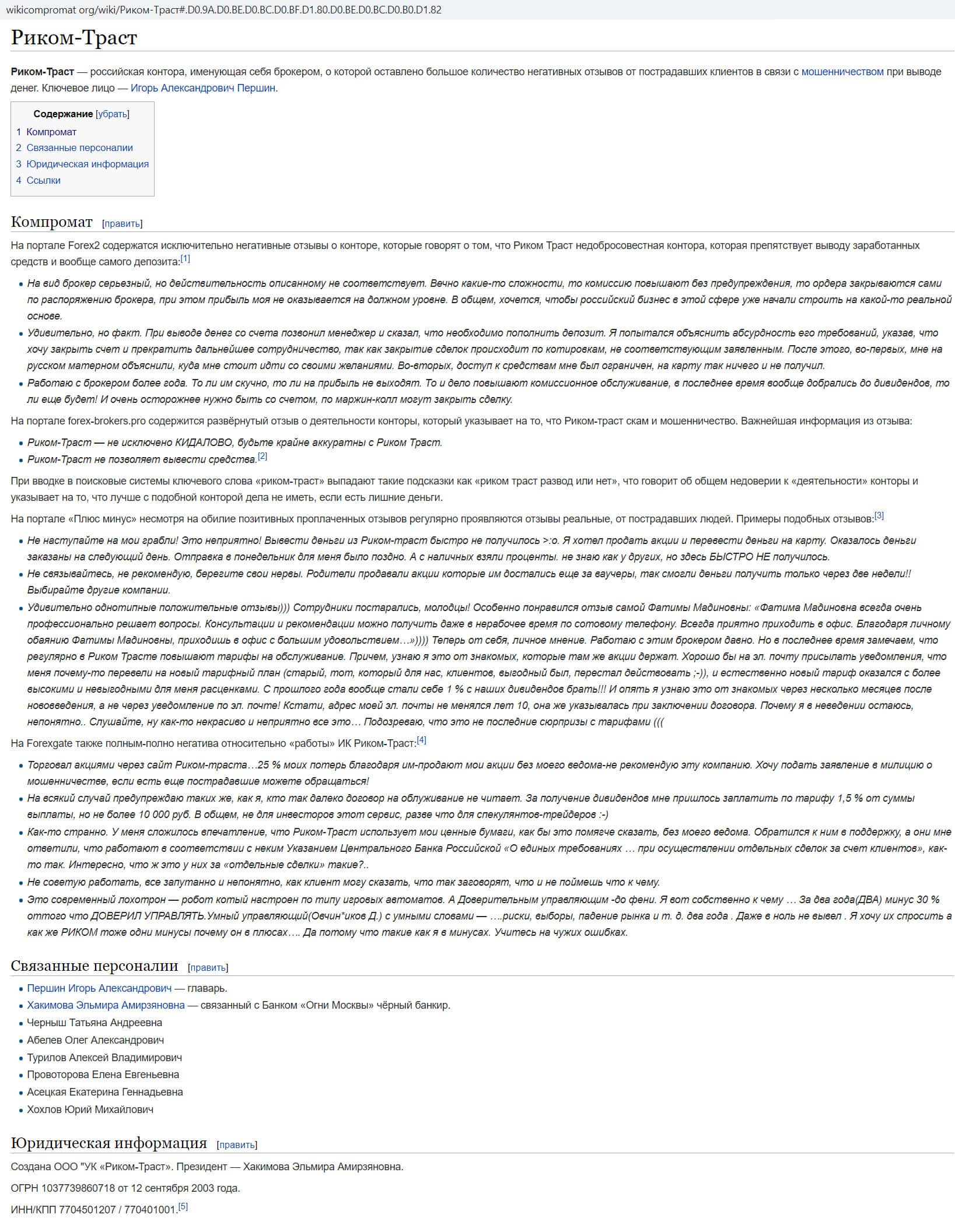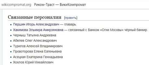 Тут опять-таки нам на помощь приходит независимый веб-сайт ВикиКомпромат орг. На нём максимально сконцентрирована информация о возможном руководстве конторы Риком Траст. Во всяком случае, там находятся все имена якобы главарей данной конторы. Среди них реальный владелец Риком-Траст, некий Першин Игорь Александрович, так и "лицо" компании, которое часто фигурирует в отзывах, как сами wikicompromat org называют её, "чёрный банкир" Хакимовна Эльмира Амирзяновна. Отчество, кстати, очень ей подходит. Так же имеются имена других, так же причастных к Риком Траст.