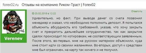 Именно так. Непрофессионализм Риком Траст достигает своего предела, когда жулики начинают толкать вполне себе обкатанную схему, которую Интернет-мошенники, спекулирующие на трейдинге, используют из года в год. В их числе и Риком-Траст. Это схема через невозможность вывода. Вы, мол внесите чуток денежек, и мы деньги сразу выведем. Если откажешься, тот тут тебя покроют трёхэтажным матом. Стоит ли пояснять, что в серьезных компаниях менеджеры таким образом общаться с клиентами просто не имеют права, но если отбросить эту вуаль, то всё становится на свои места.