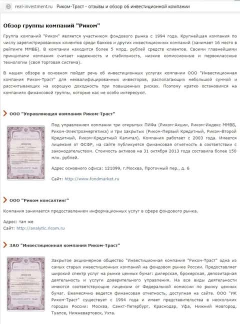 Риком-Траст – очередные мошенники во Всемирной Паутине. Под видом серьезной инвестиционной компании, данные жулики разводят своих клиентов как на мелочи по типу повышения комиссии и взятия большого процента с дивидендов клиента (при чём всё это делается без его ведома), так и стандартных мошеннических, когда на просьбу клиента о выводе "менеджер" требует вкинуть еще денег, или же просто сливает депозит клиента без его ведома. Полный фарш, так сказать. И, главное, прикрываются аферисты лицензиями и репутацией чуть ли не главной инвестиционной конторы на русских землях. Увы, реальные отзывы сплошь и рядом говорят об обратном, тогда как покупные, все как один, написаны в некачественной, абсолютно неинформативной форме. Наше оценочное суждение, Риком Траст являются мошенниками, для которых благополучие клиента – пустой звук.
