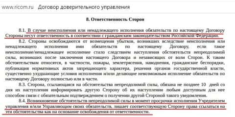 Но это был договор о брокерских услугах. Если же посмотреть договор о доверительном управлении, то тут всё еще более прозаично. Мало того, что в случае невыполнения конторой своих обязательств, решить проблему в правовом поле через суд у вас попросту не выйдет. Присутствуют также стандартные форс-мажоры как способ для мошенников Риком-Траст вновь снять с себя ответственность. При том что само понятие форс-мажоров растяжимо и может легко быть фальсифицировано лишь с целью того, чтобы облапошит клиента, и никакой ответственности за это не понести.