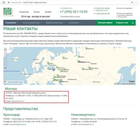 Контакты, представленные на сайте конторы аферистов Риком Траст