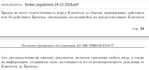 Что же по поводу договора, то тут всё, понятное дело, сделано так, чтобы и рыбку съесть, и косточкой не подавится. Непрофессиональность в очередной раз раскрывается в виде повторений одних и тех же пунктов в договоре, но это лишь маленькие придирки. Присутствует стандартная для псевдо брокеров формулировка, на основании которой, за потери клиента они ответственность нести не будут. Тут это называется "На основе заявлений Клиента любого вида". А проверить подлинность заявлений "любого вида" не всегда получается, что создаёт лазейку для Риком-Траст, когда им выгодно, оставлять клиента без денег, и ответственность за это не нести.