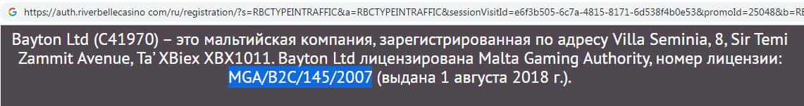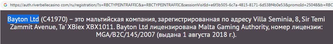 Юридическое лицо Bayton Ltd владеет мошенническим сервисом riverbellecasino com, компании Ривер Белле Казино, у которой оффшорная регуляция.