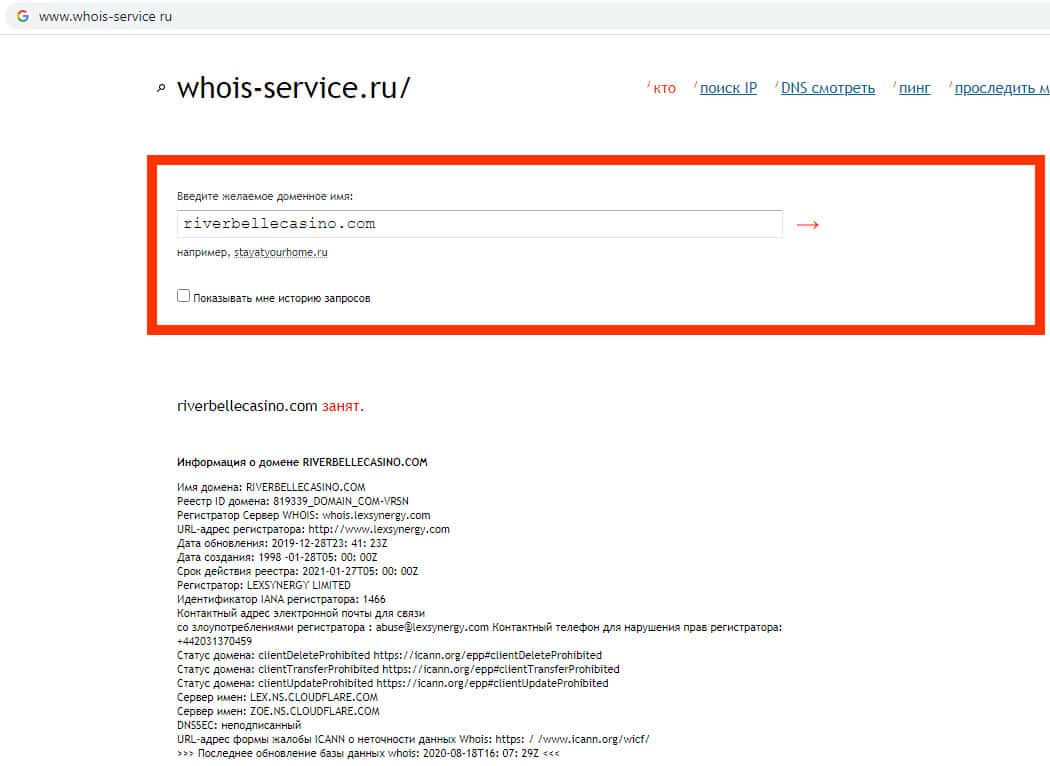 - Информация о домене онлайн-ресурса мошенников River Belle Casino
