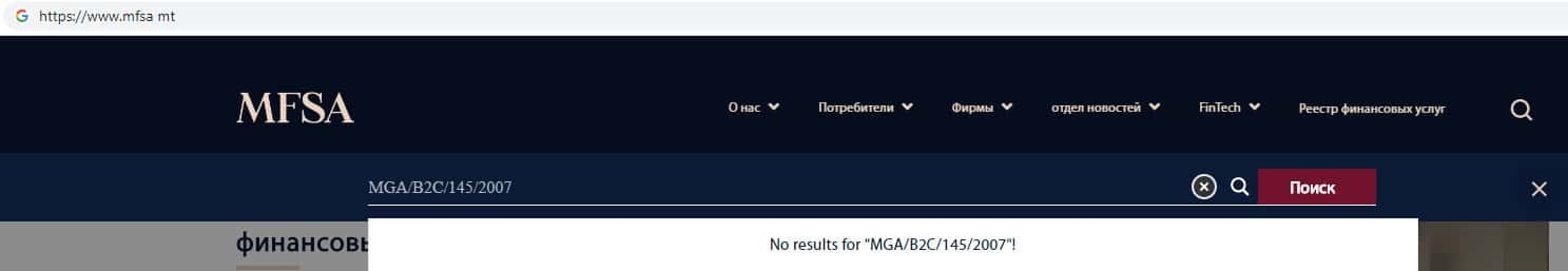 На сайте финансового регулятора Мальты о регистрационном номере скам-конторы Ривер Белле Казино результаты отсутствуют, следовательно он вымышленный.