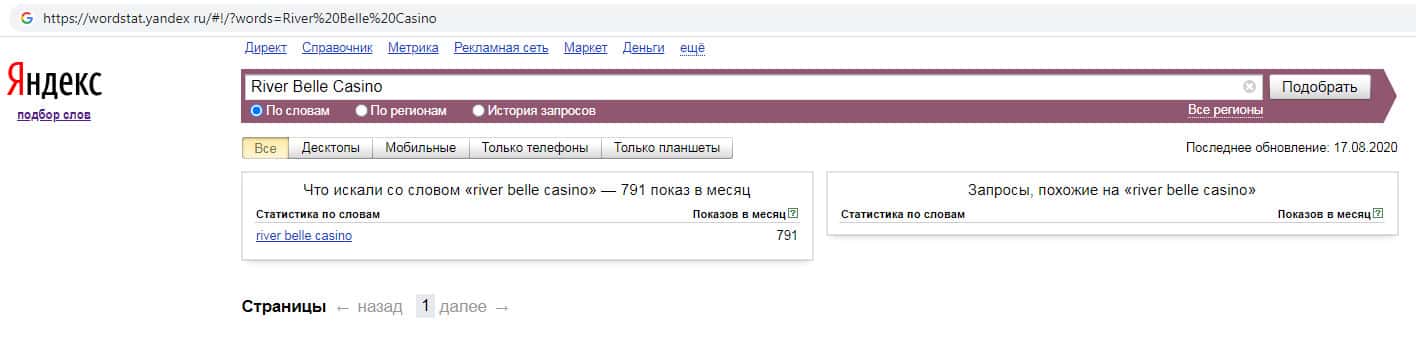 Также нет никаких данных о брендовых запросах названия компании на английском языке без пробела "RiverBelleCasino" на Яндекс Вордстарт.