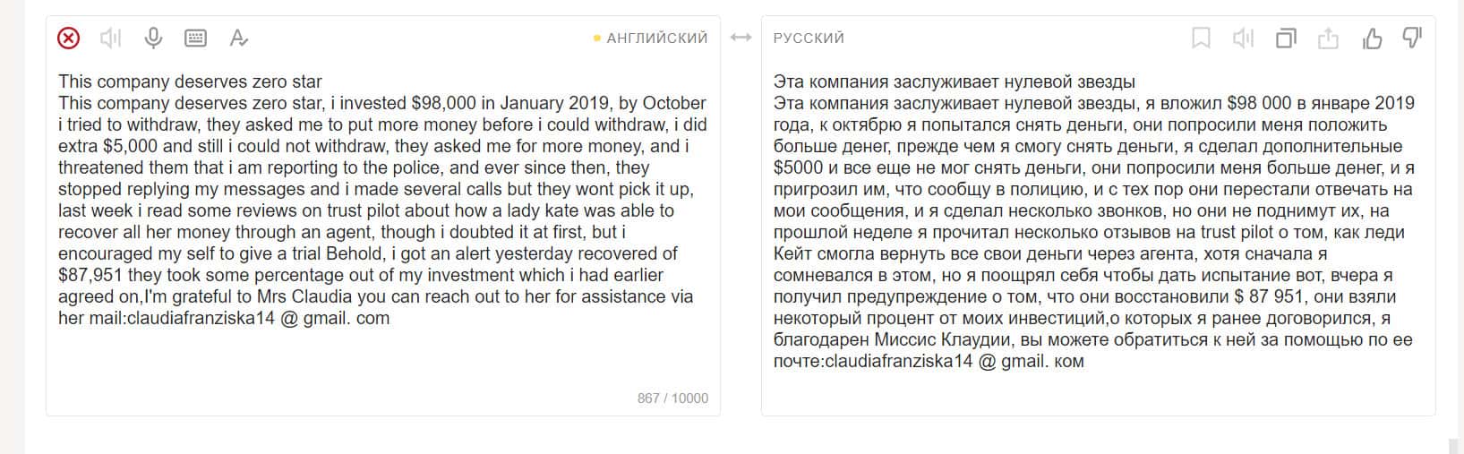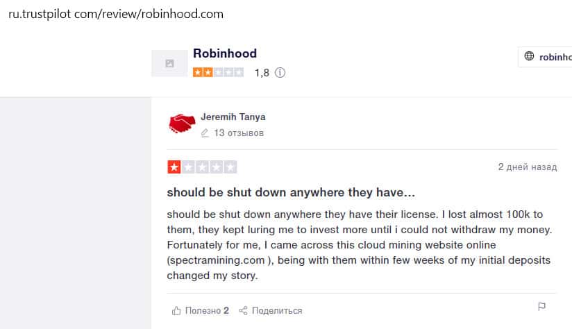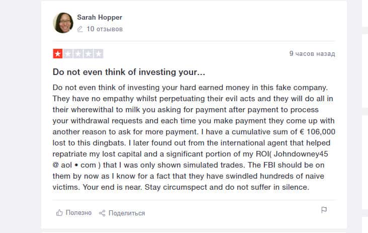 Джереми написал на сайте Трастпилот, как он потерял более 100 000 долларов, связавшись с мошенниками из Робин Гуд Брокер. Жулики продолжали заманивать его, уговаривая вложить еще и еще больше. Наконец, Джереми захотел сделать вывод средств, но не смог.