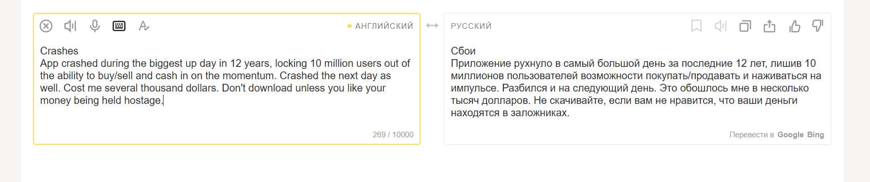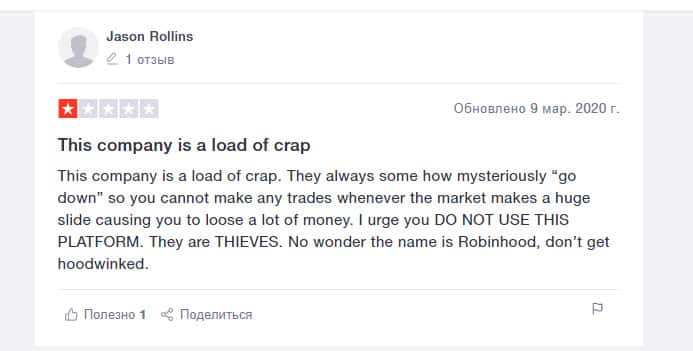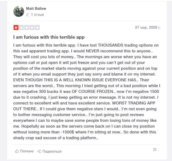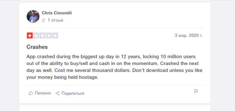 Еще один пользователь сообщил, что приложение Робин Гуд Брокер крайне ненадежное. Не стоит им пользоваться, если вы не хотите потерять свои деньги. Очень часто бывают сбои в его работе. Автор отзыва сам понес большие убытки из-за этого. Не скачивайте программу, если заботитесь о своих доходах.