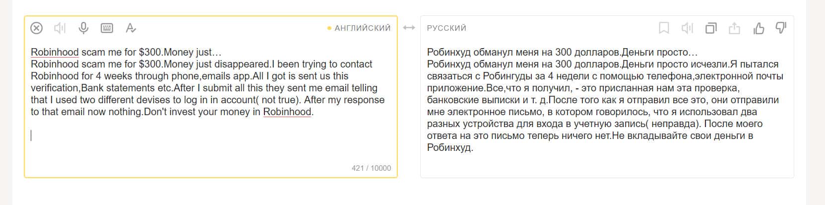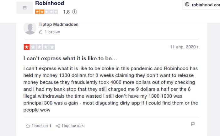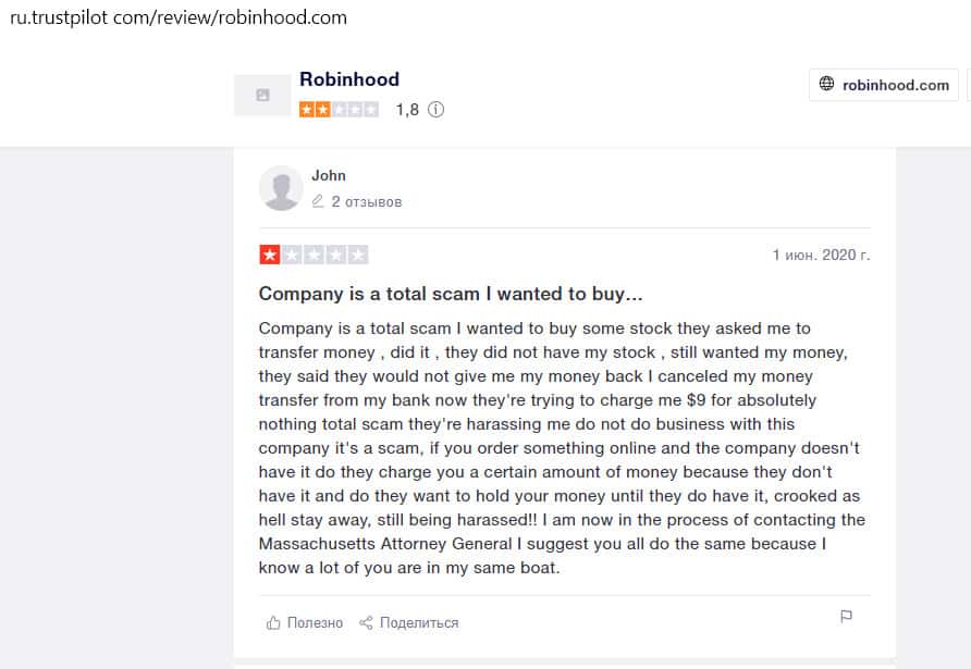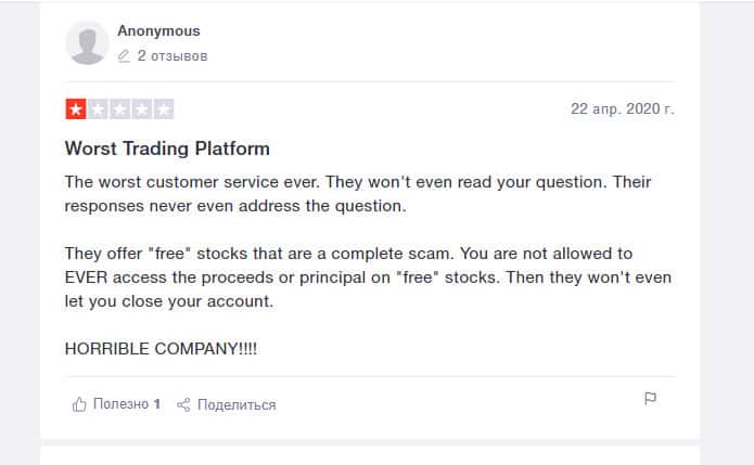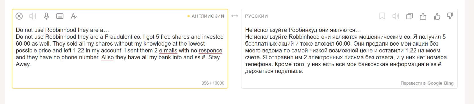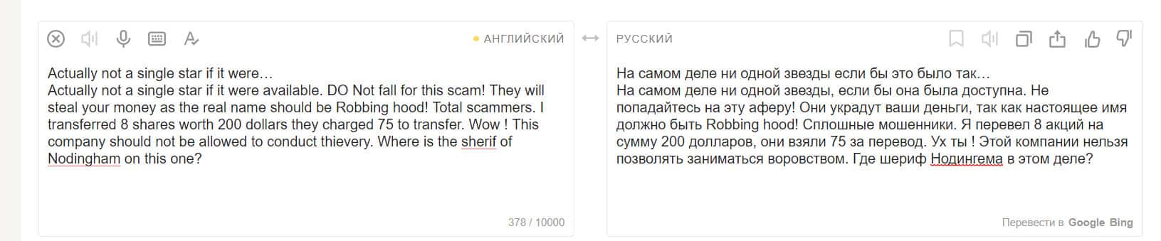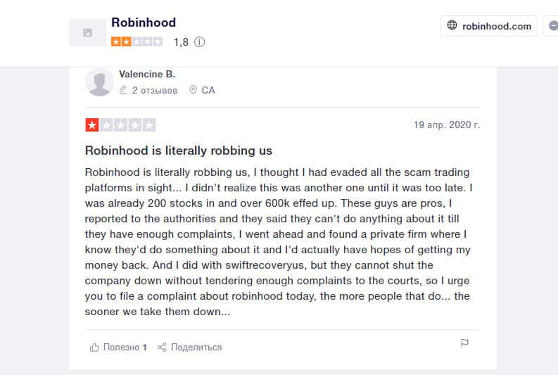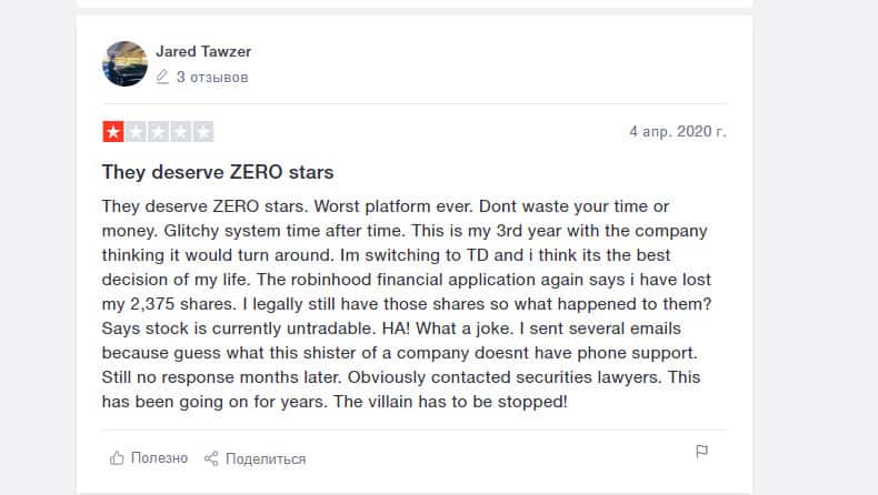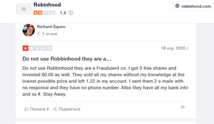 Еще один пользователь, вложившийся в покупку акций на площадке компании Робин Гуд Брокер, остался недовольным. Он считает, что это полное мошенничество. Контора предлагает людям продукты, якобы бесплатные, но это ловушка. Они не разрешат вам получить доступ к прибыли от продажи этих акций.