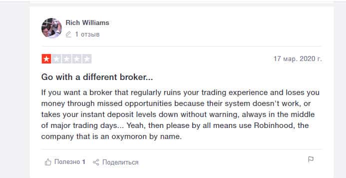 Рич Вильямс заявляет в своем отзыве, что компания Робин Гуд Брокер регулярно портит трейдинг. В результате вы теряете ваши деньги из-за упущенных возможностей. Их платформа не работает или работает очень плохо как раз в середине торговых дней. Поэтому сделки невозможно вывести в плюс.