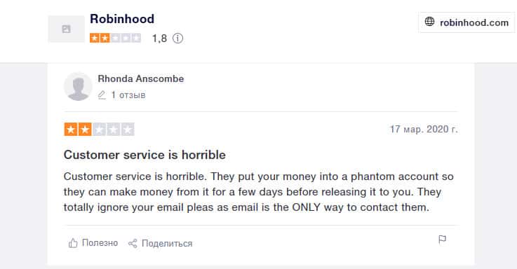 Клиенты брокерской конторы Робин Гуд Брокер обвиняют эту организацию во всевозможных грехах. Минусы этой компании расписаны во многих отзывах. Ронда заявляет, что, помимо всего прочего, организация использует фантомные счета, на которые поступают средства клиентов.