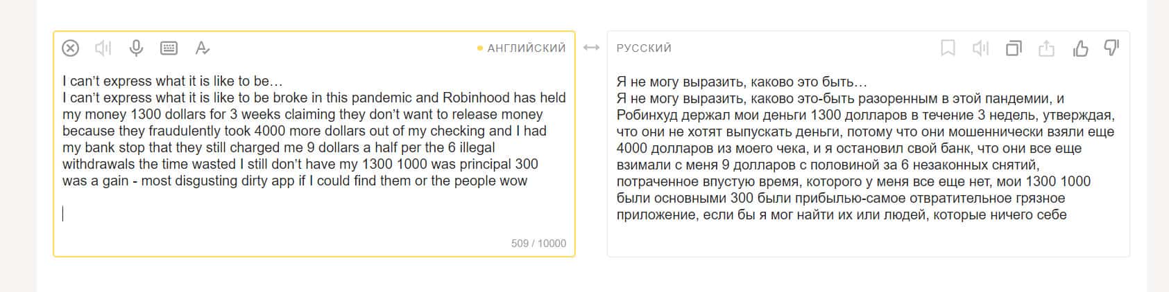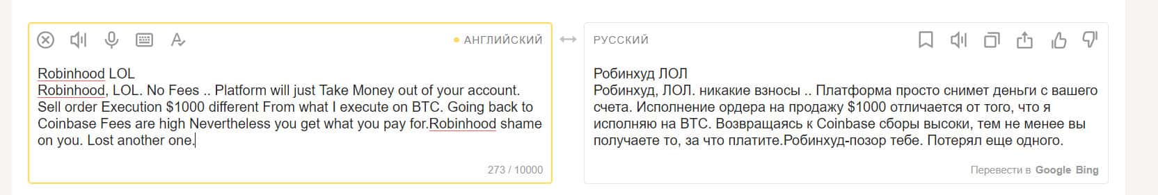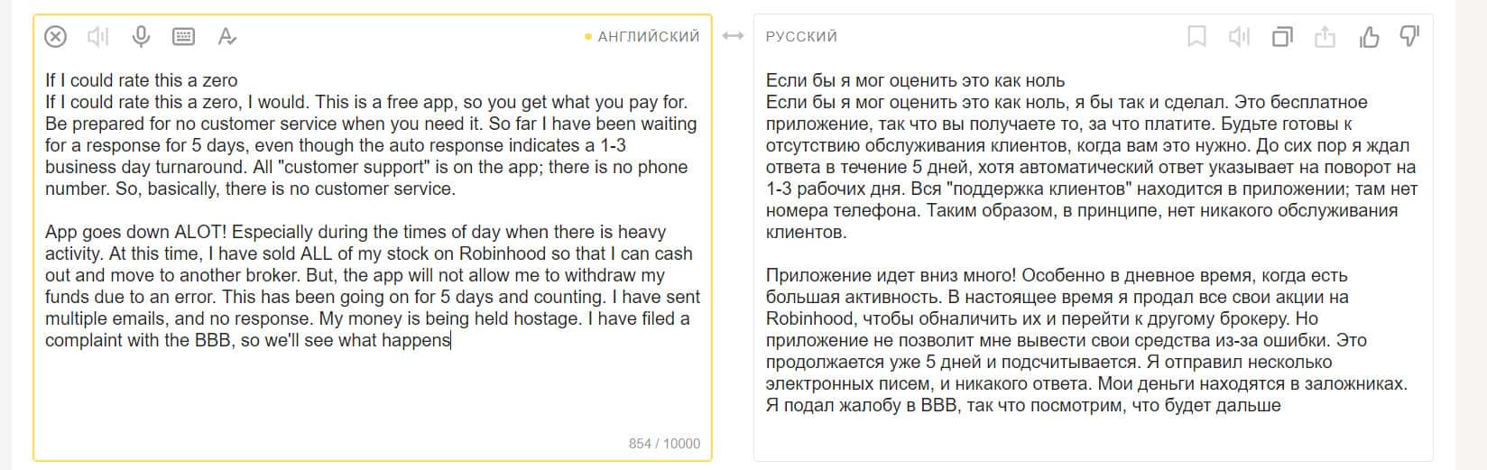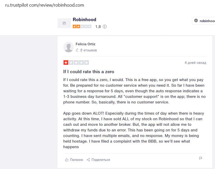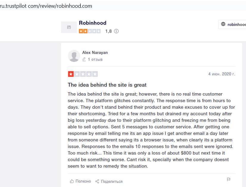 Алекс пишет, что сама по себе идея проекта Робин Гуд Брокер, возможно и хорошая, но у этой организации множество проблем. Их платформа постоянно дает сбои. Время отклика может занимать несколько дней. Из-за этого Алекс потерял 800 долларов. Он отправил в поддержку 5 сообщений.