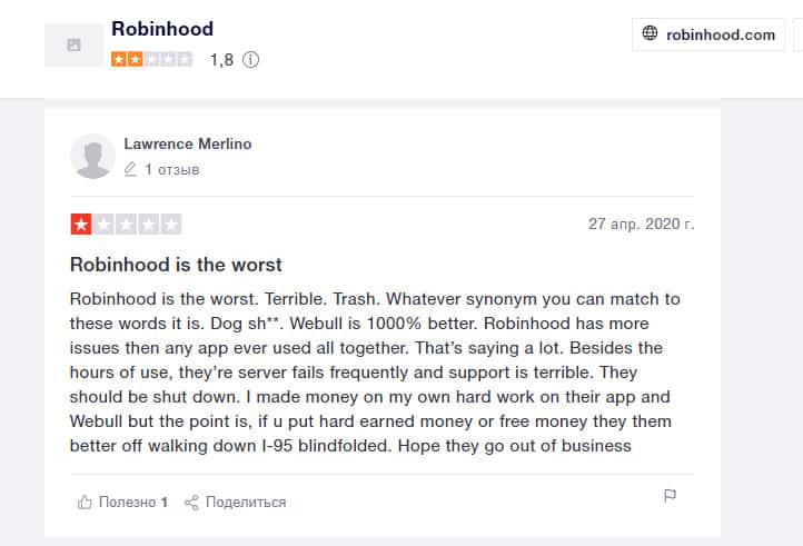 Лоуренс Мерлино оставил о брокере Робин Гуд Брокер очень плохой отзыв. По его мнению, это самое худшее приложение из всех имеющихся. И какое бы плохое слово вы ни подобрали, оно подойдет к этой шулерской конторе. У них часто отказывает сервер, а служба поддержки просто ужасна.