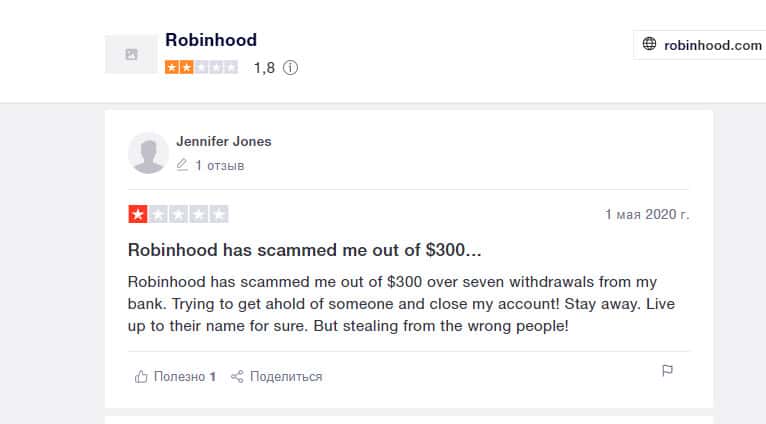 Дженнифер считает компанию Робин Гуд Брокер мошеннической, как и многие другие пользователи. Она также пострадала от рук махинаторов, которые имеют очень много уловок для обмана. У нее выудили 300 долларов, которые она перевела за несколько снятий их банка.