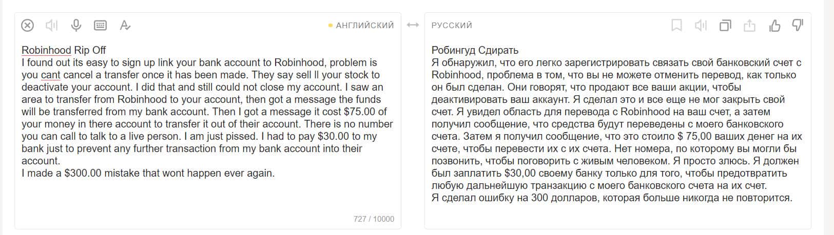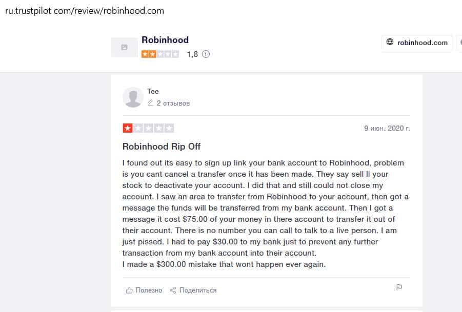 Трейдер, имевший дело с организацией RobinGood Com, очень возмущен высокими комиссиями за вывод средств. Сначала ему сказали, что для перевода денег в другой банк он должен продать все свои акции. Когда он сделал это, выяснилось, что он должен заплатить 75 долларов за перевод.