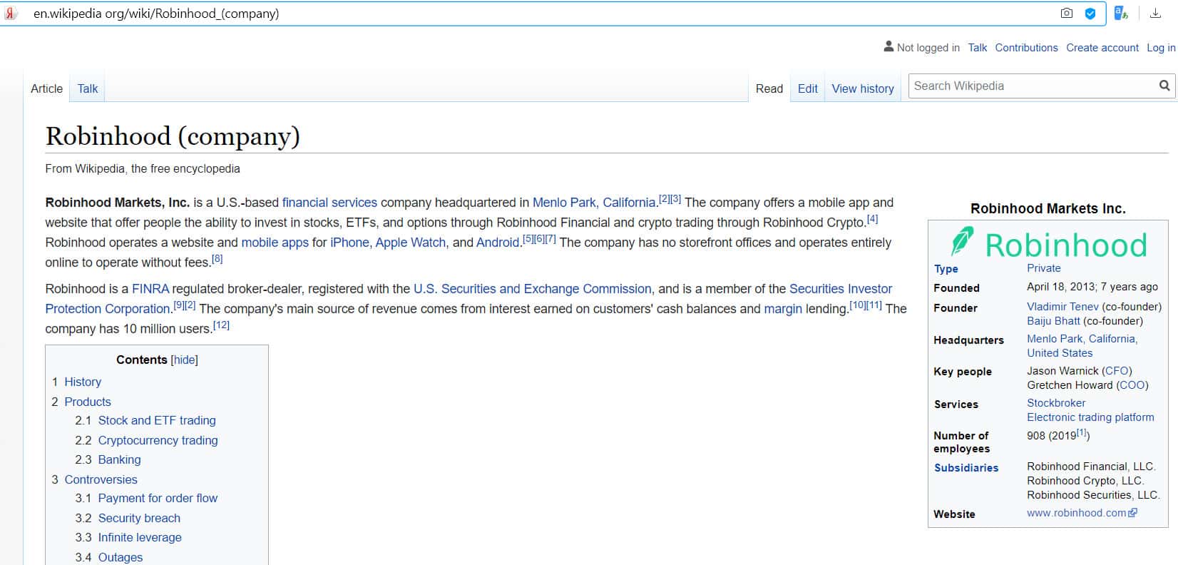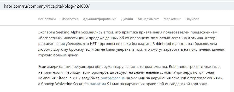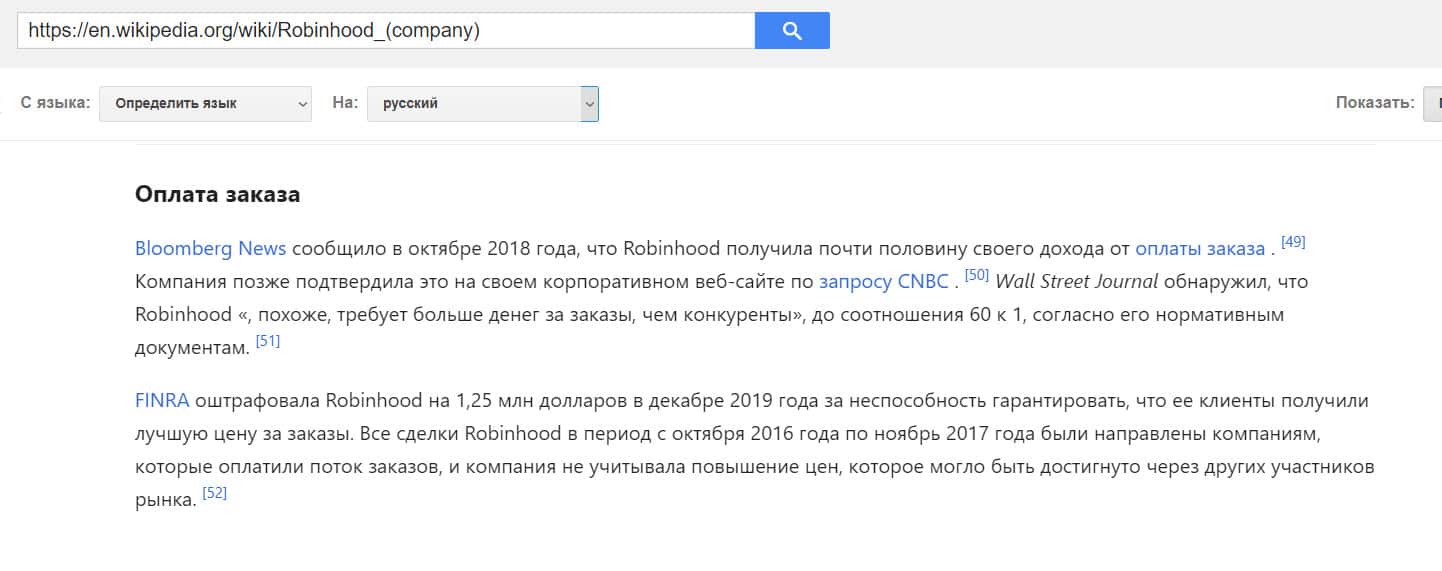 Википедия опубликовала статью о компании Робин Гуд Брокер, где расписан ряд существенных нарушений. Например, половину своего дохода контора имеет от оплаты заказов (она перенаправляет заявки клиентов другим организациям). FINRA уже штрафовала их за то, что они требуют больше денег за заказы, чем конкуренты.
