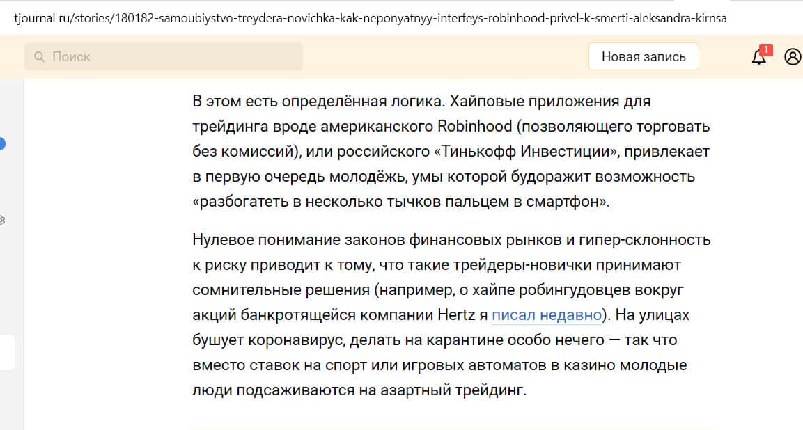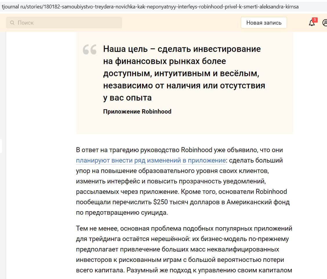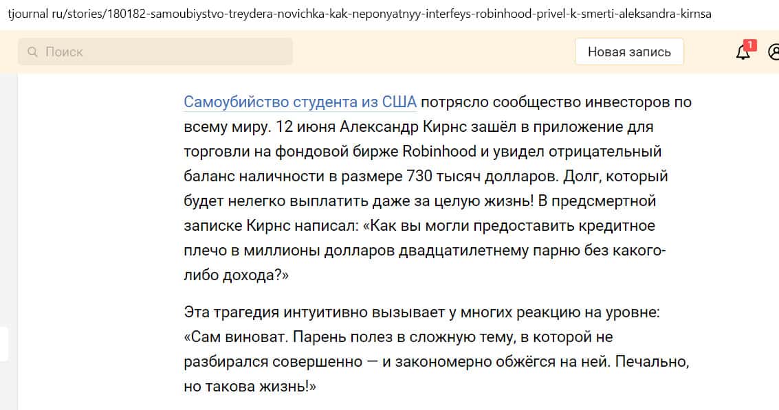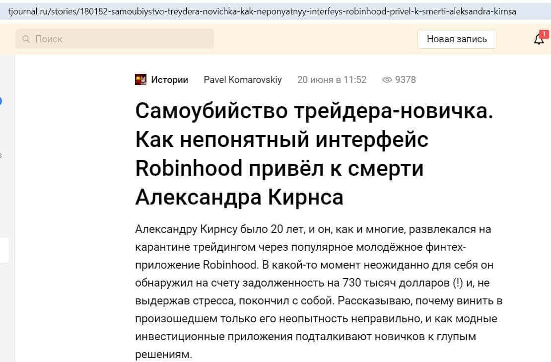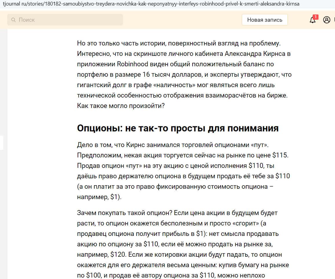 На сайте tjournal ru появилась статья о самоубийстве молодого человека, который занимался трейдингом в приложении Робин Гуд Брокер. Это был студент из Америки Александр Кирнс, ему было 20 лет. В какой-то момент он обнаружил у себя на счете огромный долг, размером в 730 000 долларов, и покончил с собой.