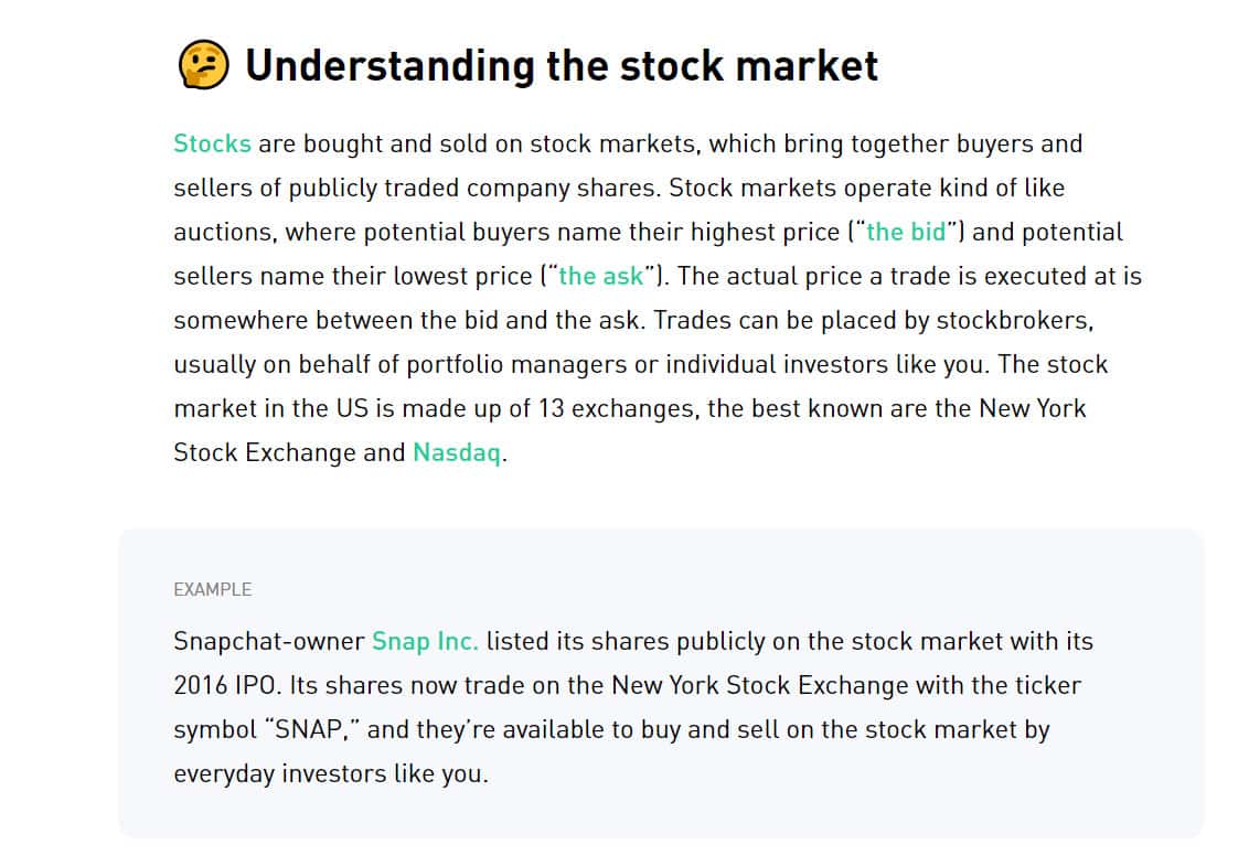 Для тех, кто совсем ничего не понимает в торговле акциями, есть раздел, где можно усвоить основы трейдинга. Там публикуют статьи и ответы на часто задаваемые вопросы. В целом все достаточно неплохо описано.