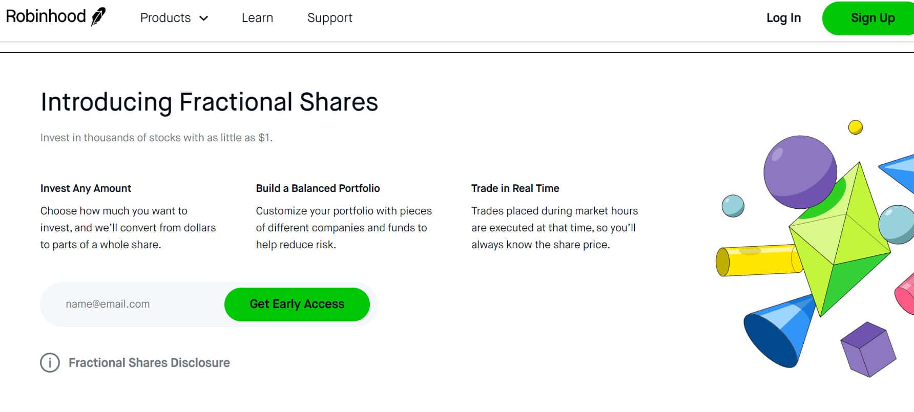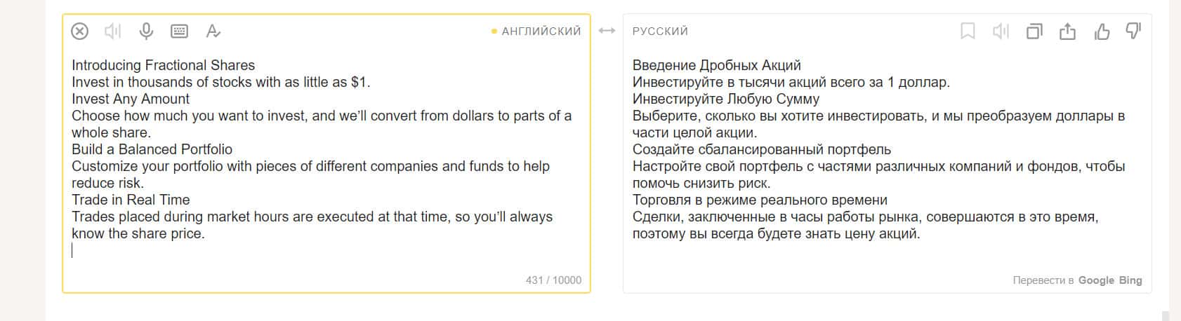 Под лозунгом Инвестиции для всех размещен инфоблок, где описываются преимущества компании. Говорится о том, что вы можете инвестировать в тысячи акций всего за один доллар. Специализация компании - торговля акциями, хотя можно торговать и криптой и другими активами.