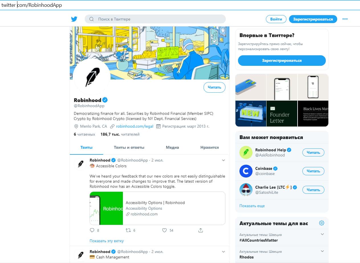 Компания Робин Гуд Брокер имеет аккаунты в популярных соцсетях: Твиттер, Фейсбук, Инстаграм и Линкедин. Все аккаунты очень хорошо раскручены, что неудивительно: брокер имеет около 10 миллионов пользователей.