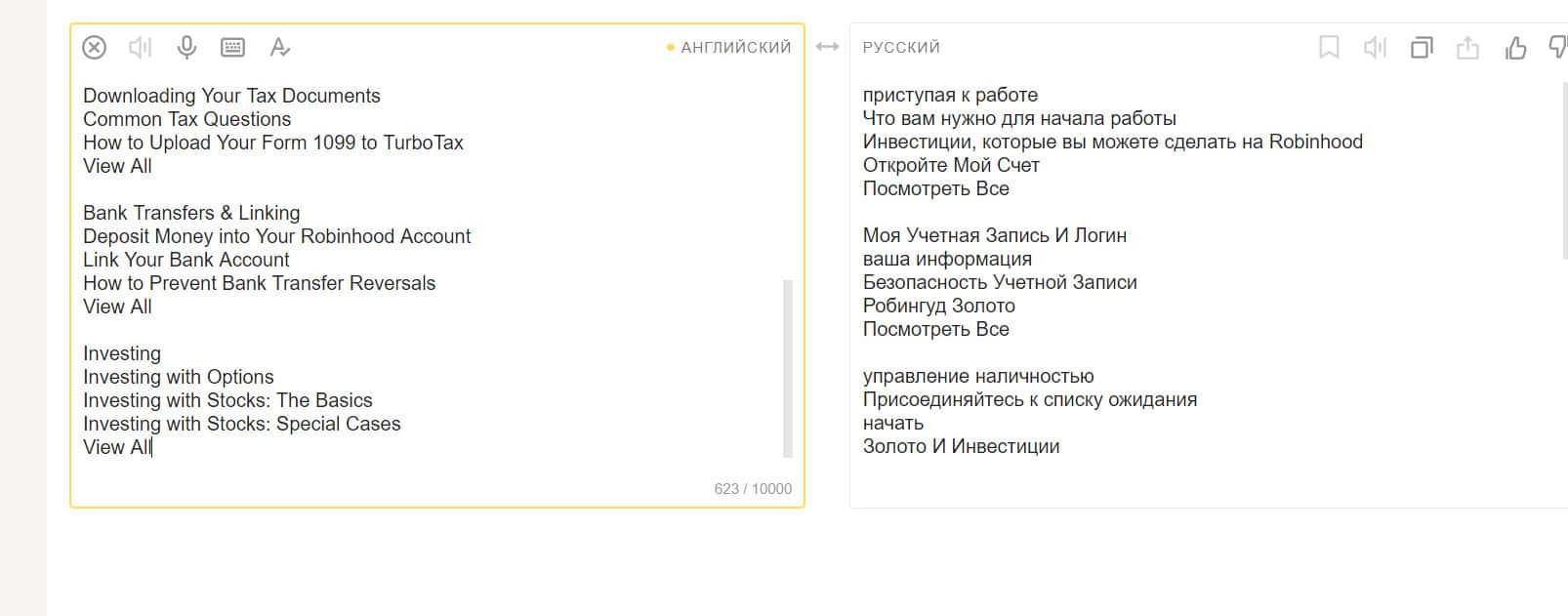 Раздел сайта RobinGood Com под названием Помощь оформлена гораздо понятнее, чем на других ресурсах. Общие вопросы разделены на категории, по каждой из которых пользователь может получить подсказки.