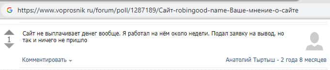 Проект РобинГуд отказался выплачивать деньги пользователю Анатолию Тыртышу. Об этом он сообщил в своём отзыве, расположенном на портале voprosnik ru. В нем он пишет, что провел на сайте Робин Гуд около недели, затем решил сделать вывод средств, подал заявку, но так ни ответа, ни денег не получил.