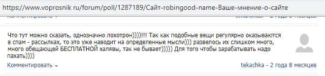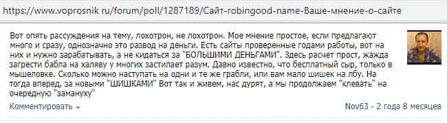 Автор статьи, расположенной на портале 4-info ru, задается вопросом: является ли сайт Робингуд нейм лохотроном или же исправно позволяет зарабатывать и выводить деньги с него? Сам же автор, сделав небольшой обзор сайта, приходит к выводу, что это еще один лохотрон, очередной разводняк, только дырку от бублика заработаете на этом сайте.