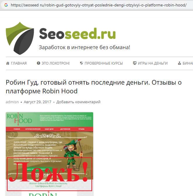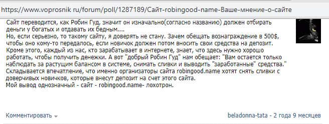 Подтверждение мнения других авторов о мошенничестве проекта Робин Гуд в отзыве Фомы Ярославского