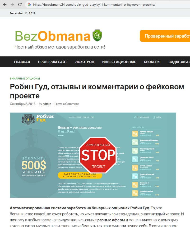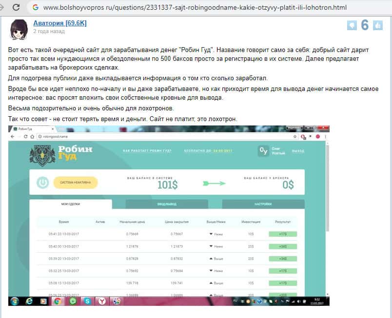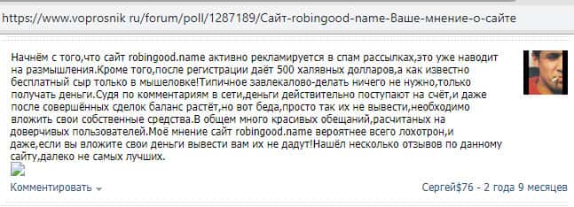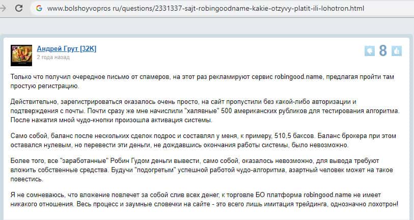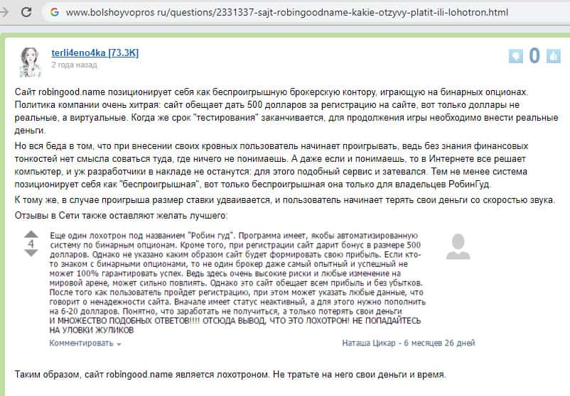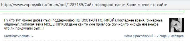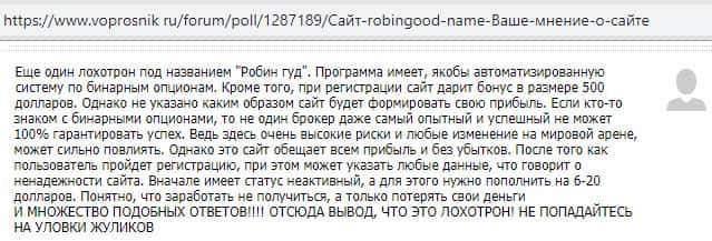 Соглашается с мнением и выводами других авторов критических отзывов о проекте Робин Гуд на портале voprosnik ru и пользователь Фома Ярославский. Он даже сетует, что для мошенников последних лет бинарные опционы являются небесами обетованными, что ни проект, предлагающий заработки на торговле бинарными опционами, то обязательно лохотрон!