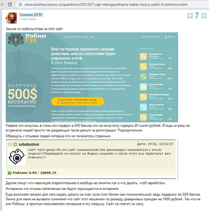 Из любопытства посетила сайт проекта Робин Гуд автор отзыва с портала bolshoyvopros ru с ником Тюшаня. Она была поражена щедрости создателей раздающих по пятьсот американских долларов за регистрацию. Эта щедрость была бы похвальна, если бы была реальной, а не выступала бы в качестве заманухи наивных простачков.