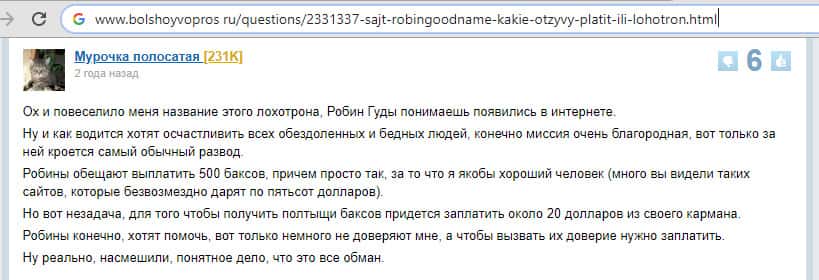 Пользователь Мурочка полосатая пришла к выводу, что проект Робин Гуд служит для увеселения пользователей Интернет. А то, как ещё не веселиться с предложения заплати двадцать долларов, и мы тебе тогда подарим полтысячи долларов. Ну реально, насмешили. Всё просто и банально. Утром деньги - вечером стулья...
