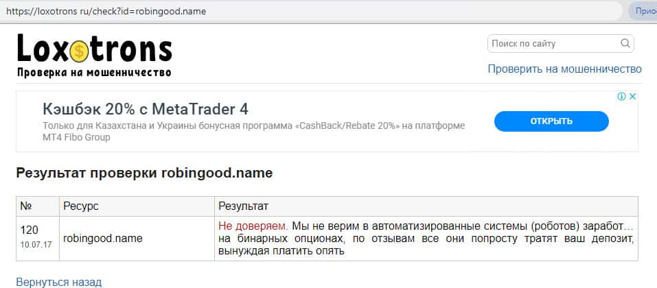 Портал loxotrons ru осуществил проверку ресурса Robingood name. Полученный им результат следующий: "Не доверяем. Мы не верим в автоматизированные системы (роботов) заработка на бинарных опционах (это очень непредсказуемая вещь), по отзывам все они попросту тратят ваш депозит, вынуждая платить опять. Если бы это было правдой, догадайтесь, кто бы ней воспользовался?".