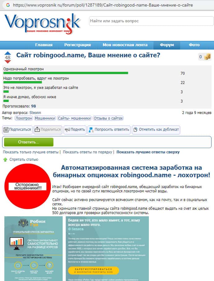 Поэтапный разбор деятельности проекта Robingood name и доказательство его мошенничества на сайте voprosnik ru