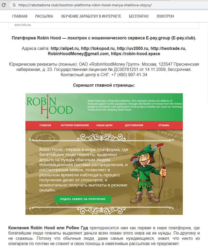- Подтверждение мнения других авторов о мошенничестве проекта Робин Гуд в отзыве Фомы Ярославского