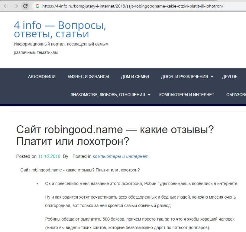 Вопросы и ответы автора статьи о природе портала Робингуд нейм на сайте 4-info ru