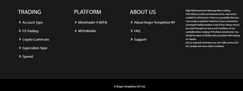Завершается сайт у лохотрона Роджер Темплтон типичными ссылками на другие разделы мошеннического сайта, а так же предупреждением о рисках, в которых лохотрон Roger Templeton NY предупреждает наивных пользователей сети о возможных потерях при сотрудничестве с мошенниками Роджер Темплтон.